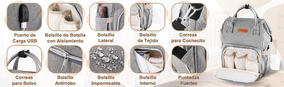 Tiene unas medidas de 36 cm x 26 cm x 48 cm, múltiples bolsillos y compartimentos internos. Además es impermeable, cuenta con puerto USB, sistema de ventilación en la zona de la espalda…